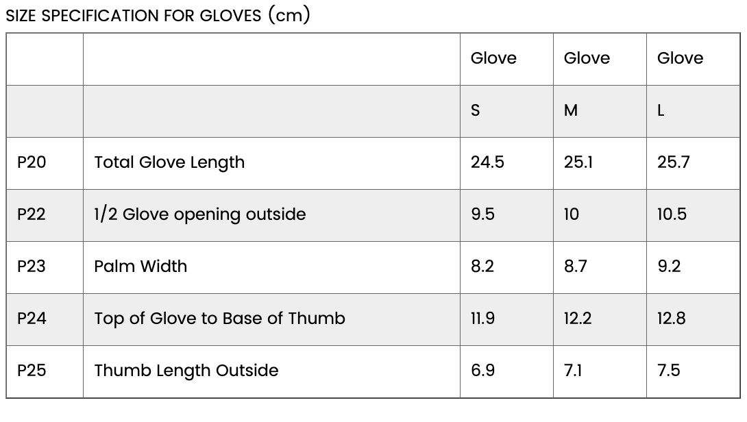 P20 | Total Glove Length | 24.5 | 25.1 | 25.7 |